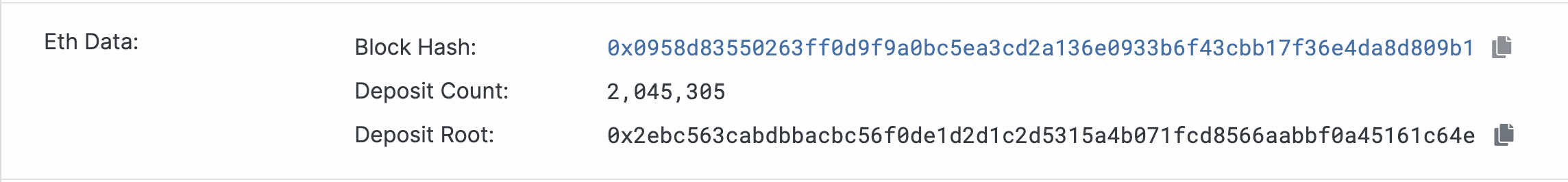 Ethereum may have thousands of nodes across the whole network, and every one of them performs the same operation: scanning the Deposit Contract for the validator list and maintaining that data in its own local database state. Then, when it is that node’s turn to propose a block, it takes the validator list it has been maintaining, calculates a total Deposit Count and Deposit Root, uses them as the value of the eth1_data field, and submits that in the block data: