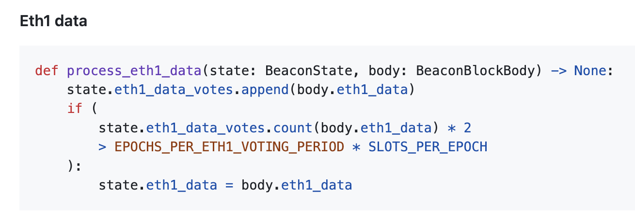 Ethereum’s protocol design requires that eth1_data must match on more than half of the nodes before it takes effect. Note that the ratio here is 1/2, which is different from the magical 2/3 ratio used elsewhere.